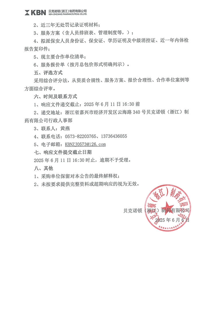 贝克诺顿(浙江)制药有限公司保安服务外包项目采购公告